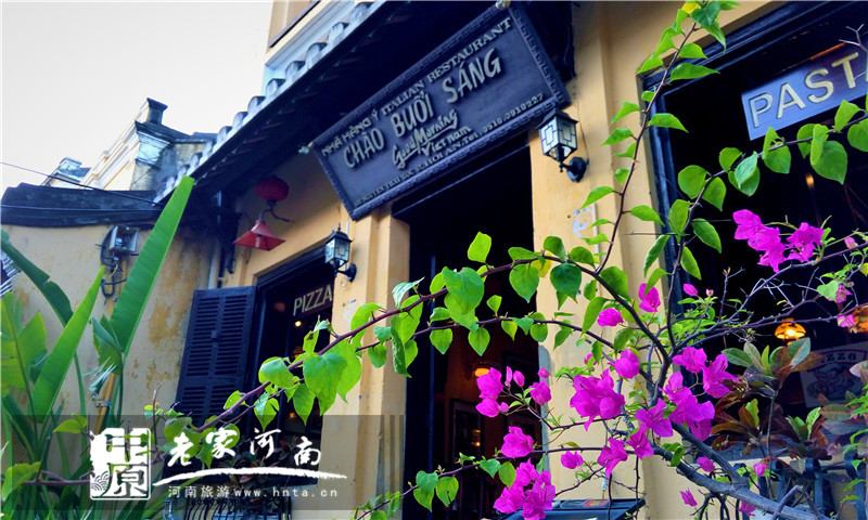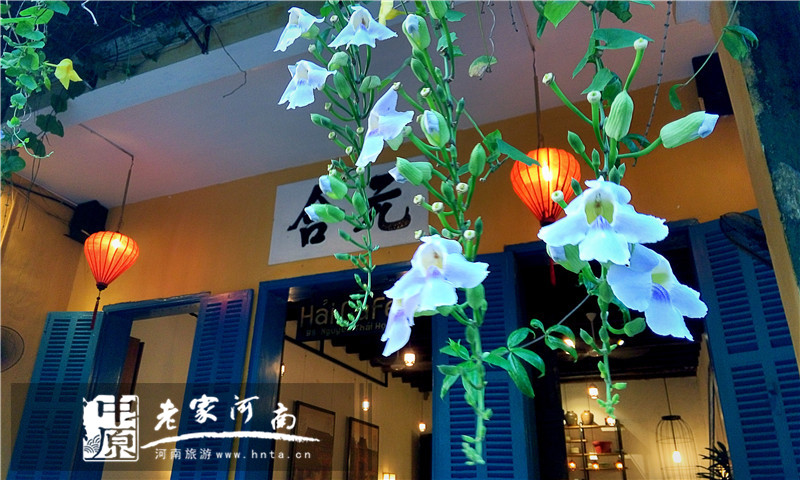 会安的家庭小旅馆都很有特色,都是三四层楼高的样子,门前有个小花园,摆着几张桌子和椅子供游人发呆。外墙一律是彩色的,有蓝有黄有绿,而且都种了好多花花草草的,看得出来,这里生活很休闲。