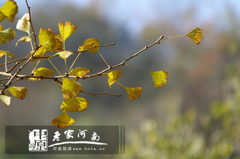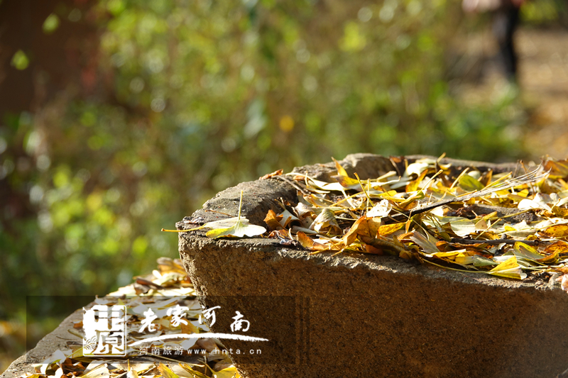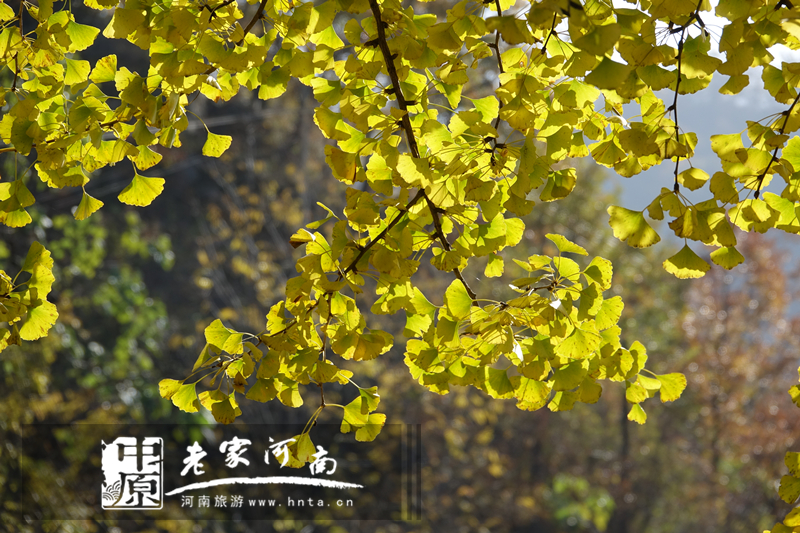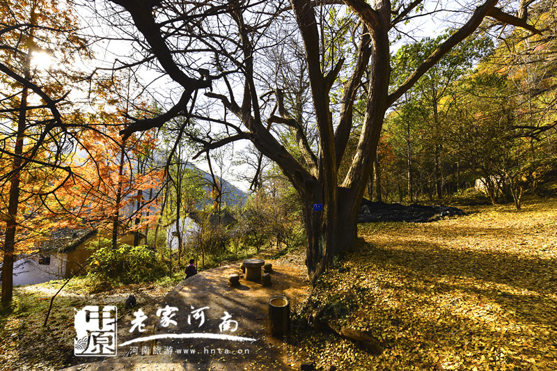 秋天的银杏树林还极具观赏价值,霜降过后,银杏树叶开始变黄,阳光照耀下,抬头金色满目,低头黄叶铺路,挺拔耸立的树干,古老苍劲的树枝,更有群山叠叠呼应,流水潺潺作乐,红叶黄花衬托,怪石嶙峋相映,令人陶醉其中。(摄影 张振亚)