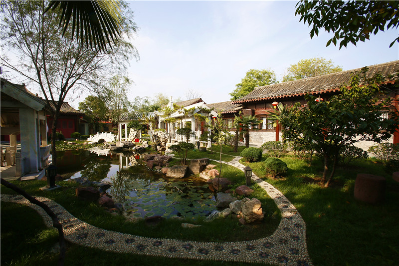 庭院呈三面环水的半岛,亭台楼榭,曲径通幽,青砖、灰墙、黑瓦、飞檐、典型的宋代建筑风格。