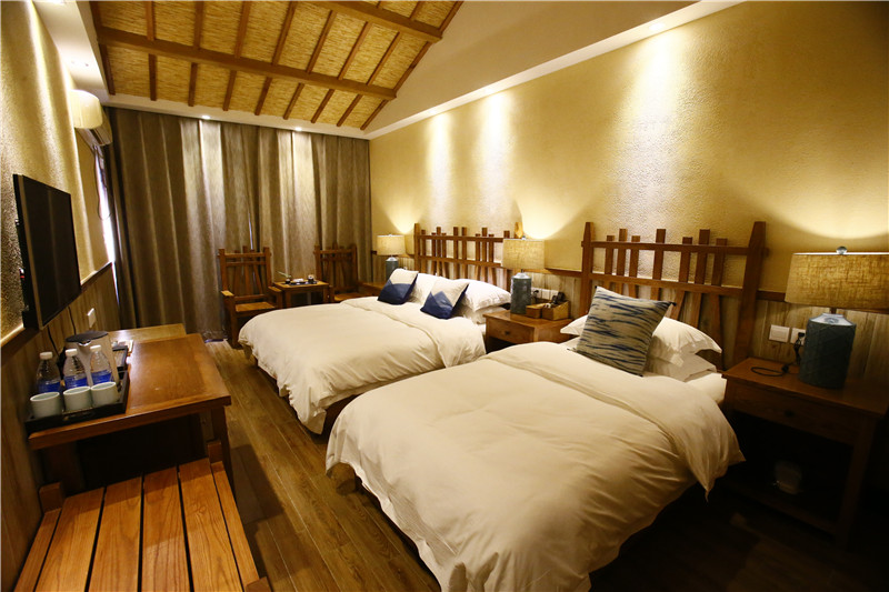 房间整体色系以暖色调为主,黄河水泥质感的墙面,纯木质的家具,加上原木、粗麻、枯枝、草编、竹艺手工泼墨油纸伞灯等,让整个房间拥有了粗犷又不失清新的气息。