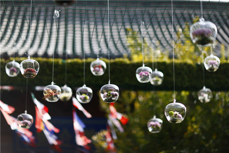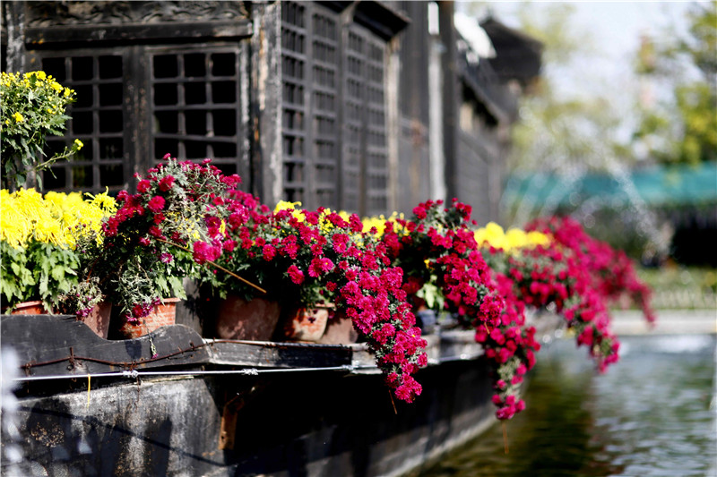 做为本届菊花文化节主会场之一,清明上河园展出的菊花不但色彩艳丽,而且造型、品种更是繁多。幽静的市井街道与瑰玮建筑掩映在斑斓的秋色中,徜徉园区,令人宛如置身于童话世界中。配着周围的菊花花海,让人沉醉、让人流连!(摄影 刘永海)