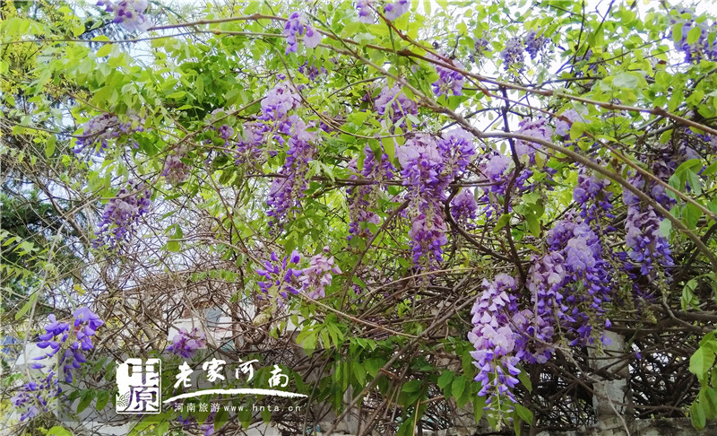 在牡丹的感召下,栾川山野间百花争春,乡间小路旁的梨树开出了一串串洁白的梨花,田野间连翘花迎风舒展,紫藤花绽放出柔嫩的淡紫色小花。
