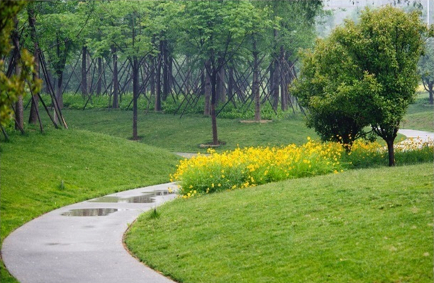 公园的人行道上栽着各种观赏树木草坪,满目绿色,鸟语花香。(图:泉之海V)